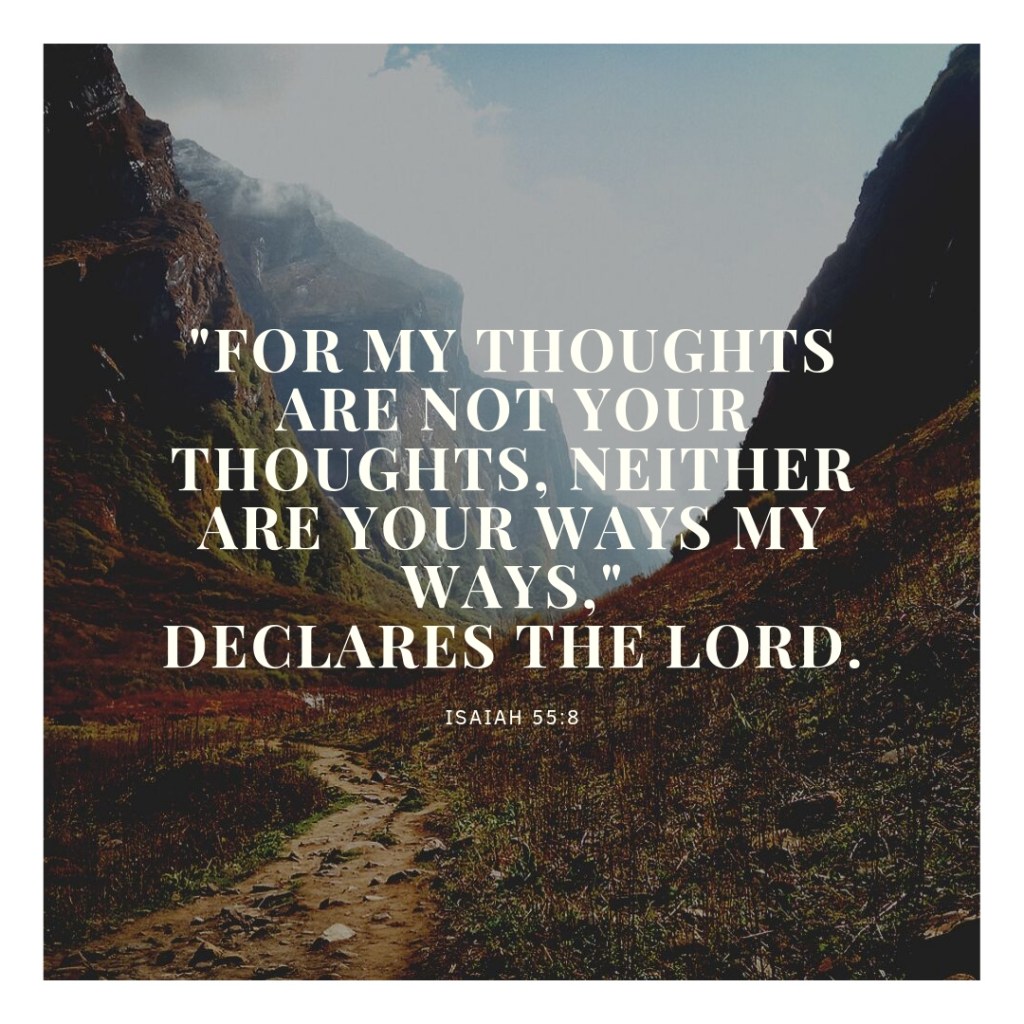 “For my thoughts are not your thoughts, neither are your ways my ways,” declares the LORD. “As the heavens are higher than the earth, so are my ways higher than your ways and my thoughts than your thoughts.” ~Isaiah 55:8-9 NIV